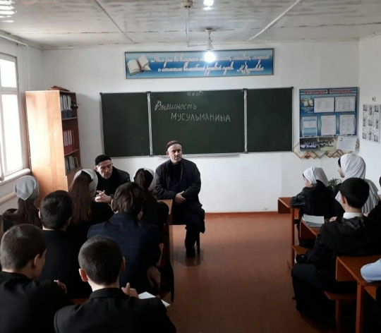 18 января в школе имамом села Новый-Шарой Сулаевым Н. и педагогом ДНВ Суриевым И. была проведена беседа на тему "Внешность мусульманина".